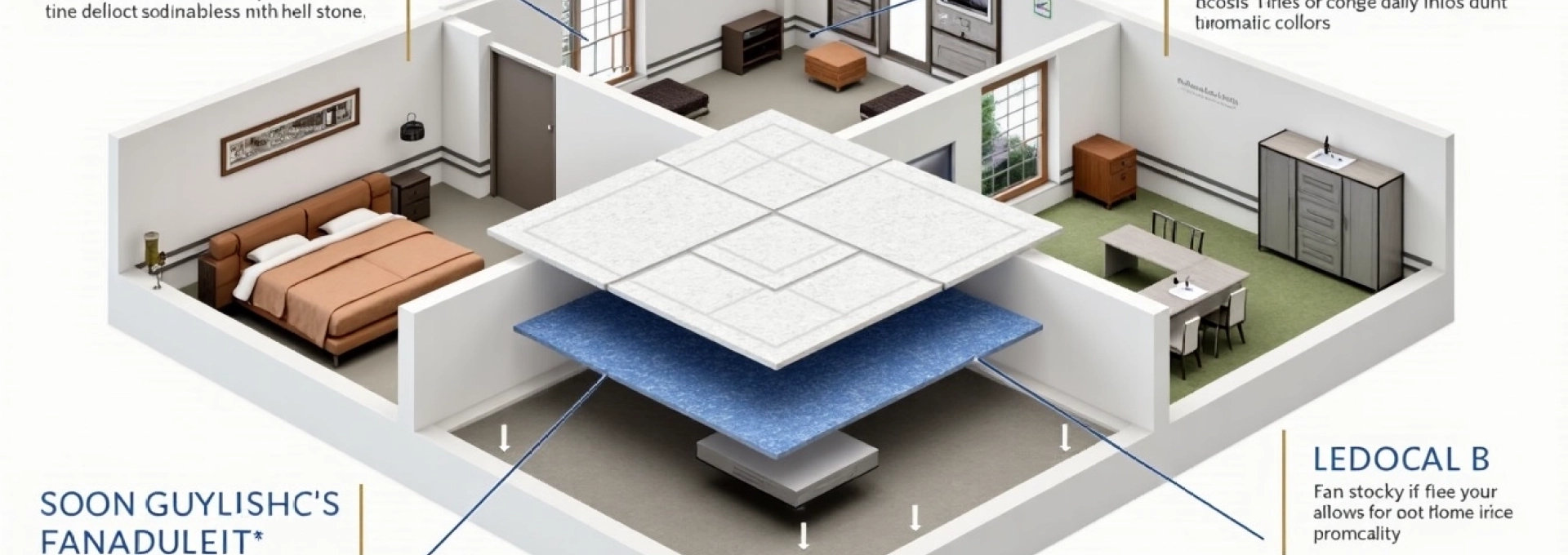 Les dalles acoustiques améliorent la qualité sonore de la pièce. Les dalles absorbantes réduisent le bruit ambiant, tandis que les dalles réfléchissantes redirige le son vers des zones spécifiques. Par exemple, les dalles acoustiques « Ecophon » sont disponibles en plusieurs finitions et permettent de créer des plafonds acoustiques performants et esthétiques.